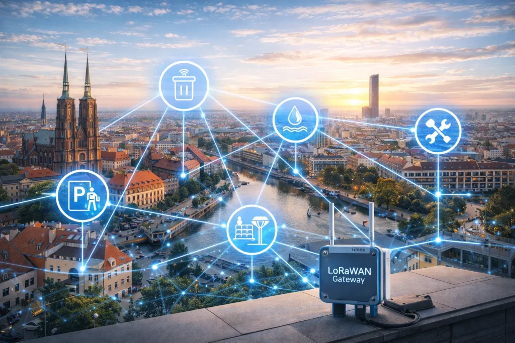 Wrocław, a major city in Poland, provides a great example of a fast-follower city embracing IoT to tackle local issues. In recent years Wrocław has built out a robust low-power IoT network covering the city, using LoRaWAN (Long Range Wide Area Network). This network enables the city to connect thousands of battery-powered sensors over long distances at low cost – forming the communications “nervous system” of its smart city initiatives. Uniquely, Wrocław worked with academic partners (Wrocław University of Technology) and industry (telecom providers) to deploy LoRaWAN gateways at strategic points, and made the network open for public use – meaning startups and universities can use the city’s IoT network to connect their own sensors for experimentation. On the application side, Wrocław has piloted a number of IoT-based services. One notable project is smart waste management: the city installed “intelligent dustbins” with sensors that report their fill level at 25%, 50%, 75%, etc., and even send alerts if vandalize. This data feeds into a system for optimizing garbage truck routes – trucks are automatically directed to only those bins that actually need emptying, which reduces unnecessary trips, fuel usage, and street clutter. Another project is SmartFlow, an intelligent water network management tool that uses pressure and flow sensors across the water grid to detect leaks early and manage water distribution efficiently. Wrocław has also modernized street lighting by installing LED lamps with IoT controls (able to dim or brighten in response to real-time conditions), and implemented smart parking systems for buses and disabled parking spots using sensor data.